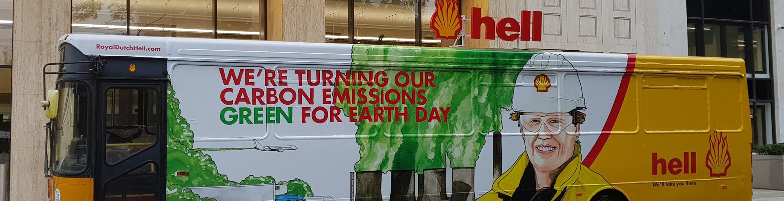 His latest project is the Hell Bus, a pre-apocalyptic marketing suite about oil company greenwashing, satirising the absurd spectacle of oil and gas corporations attempting to convince the public that they’re going to help save the world from oil and gas corporations.
